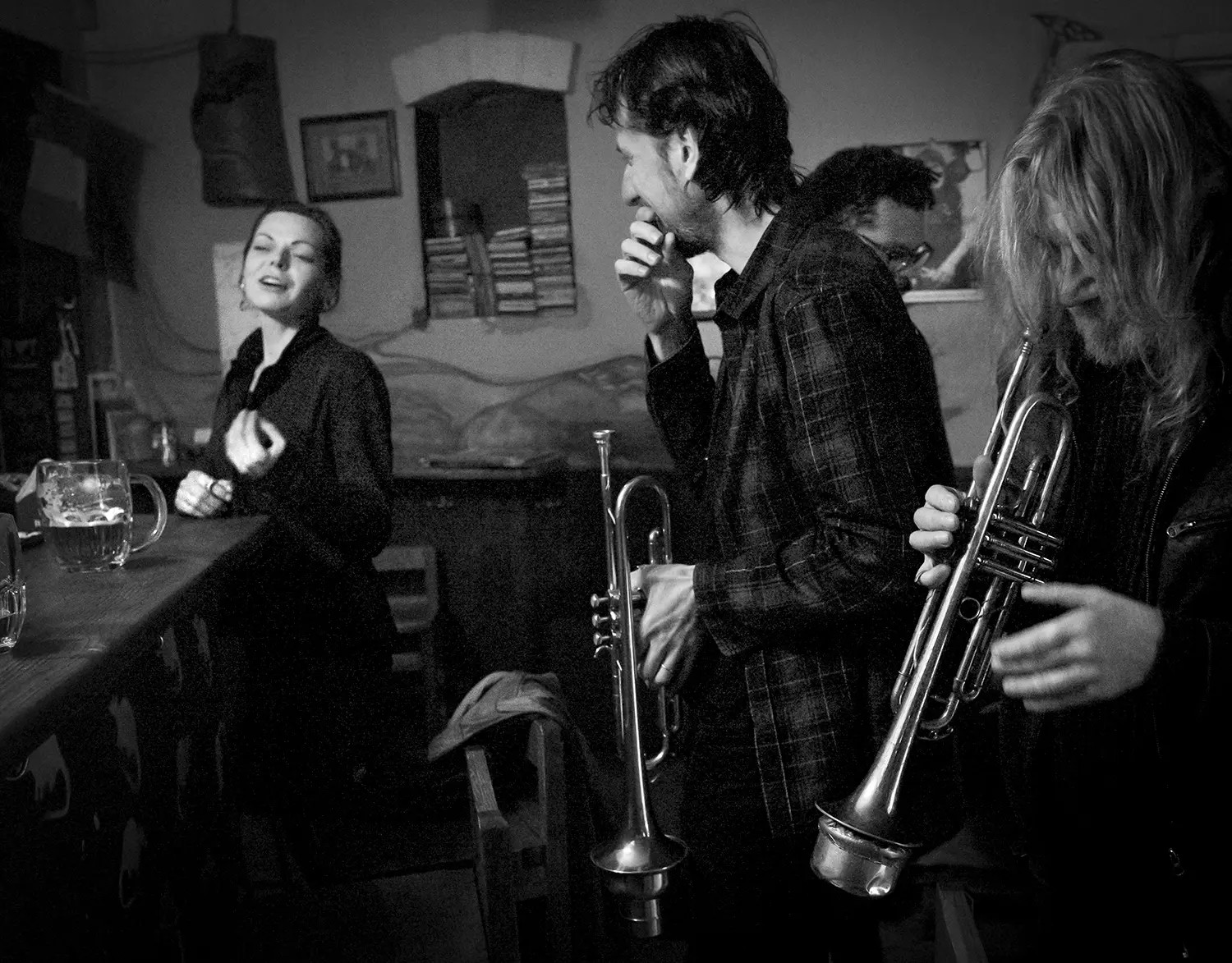 Jejich dialog střídavě přehlušuje zpěvačka doprovázená dvěma trumpetisty. Saxofon si prý odskočil na záchod.